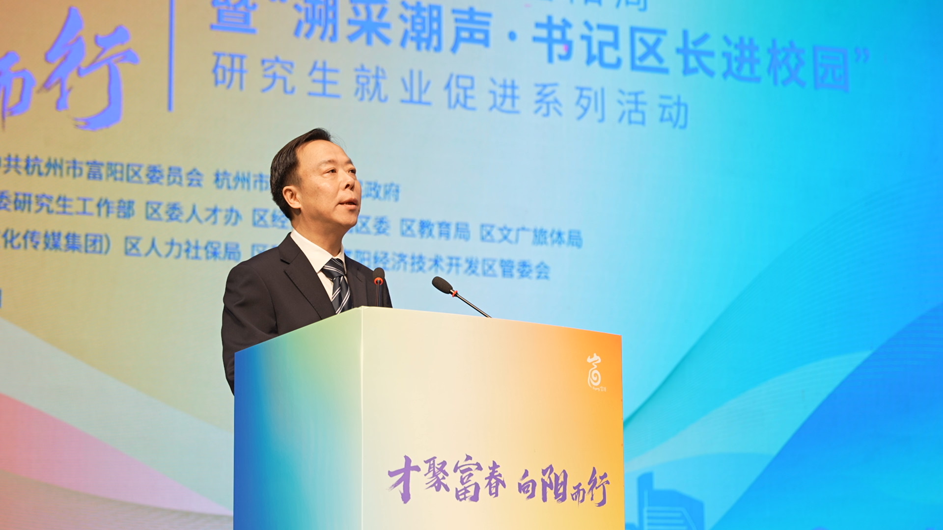 11月17日上午,“才聚富春,向阳而行”beat365登录入口官方富阳周暨“溯采潮声·书记区长进校园”研究生就业促进系列活动开幕式在屏峰校区举行。校党委书记蔡袁强、富阳区委书记王牮致辞,富阳区委副书记、区长谢渐升作城市推介,杭州市委人才办副主任尹凡,杭州城西科创大走廊党工委委员、管委会副主任李洁,杭州市委教育工委专职副书记、市教育局党组副书记陈萍,杭州市人才管理服务中心(杭州市人事考试院)党委书记主任张锦,杭州市科技局党组成员、二级巡视员宋新剑,beat365登录入口官方校领导金晓明、胡军、吴巨慧,富阳区领导万重丰、何献忠、蒋晓青、詹艳青、黄泽、凌涛,学校相关职能部门、学院负责人以及师生代表,在富企业家代表、青年代表,富阳区相关部门负责人参加活动。