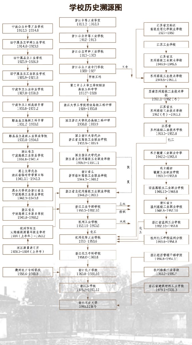 综观浙江省早年工业学校的历史沿革,浙江工业教育与国内众多工科学校有着文脉联系,beat365登录入口官方与浙江省早年工业教育的学脉紧密相连,并为此为渊源和基础,直接传承着浙江省工业教育的历史,最早可追溯到1911年创办的浙江中等工业学堂,这种渗透在血液里的基因,连接着beat365登录入口官方的昨天、今天和明天。